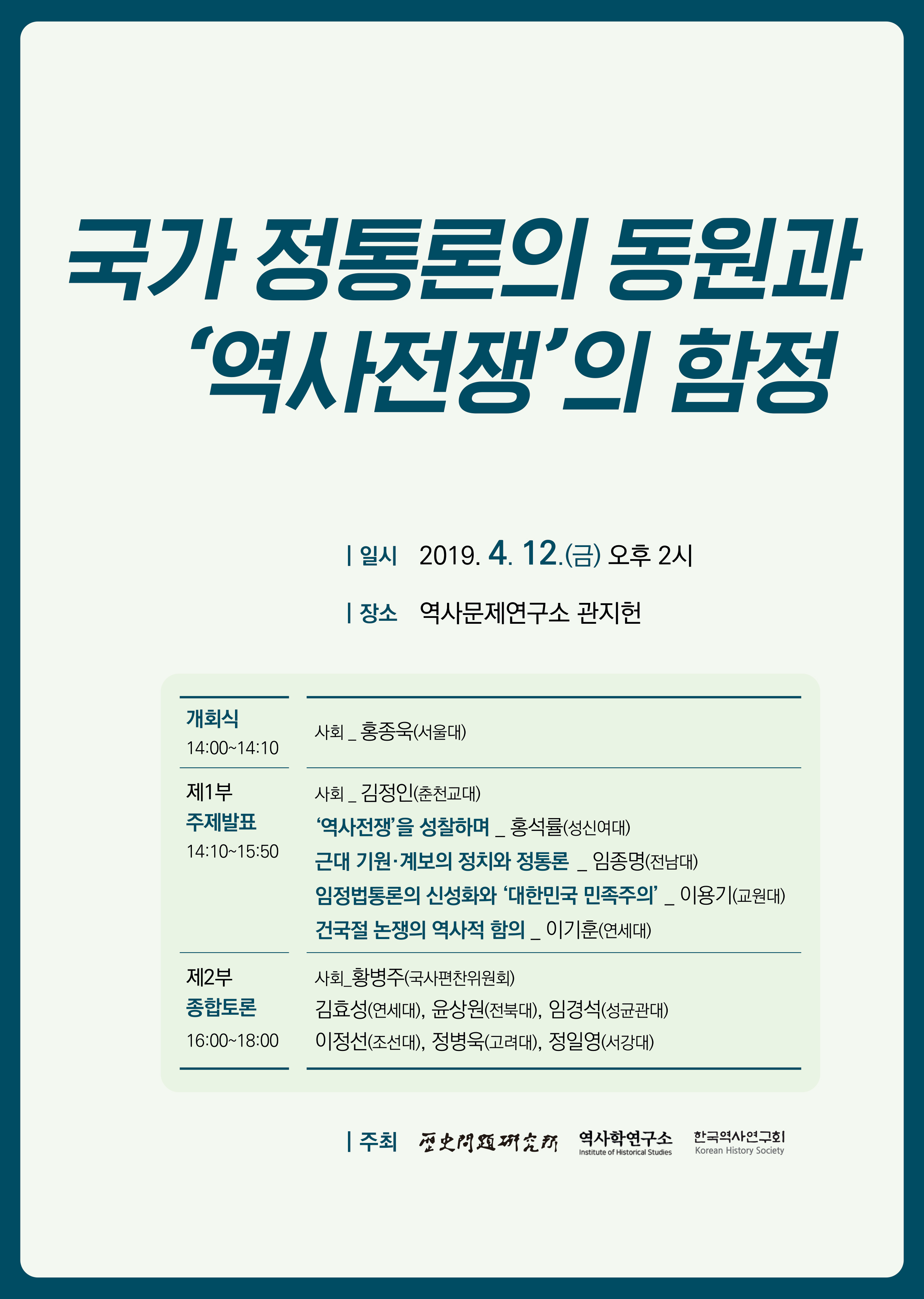 역사문제연구소, 역사학연구소, 한국역사연구회는 4월 12일(금)에 “국가 정통론의 동원과 ‘역사전쟁’의 함정”이라는 학술회의를 공동 개최합니다.